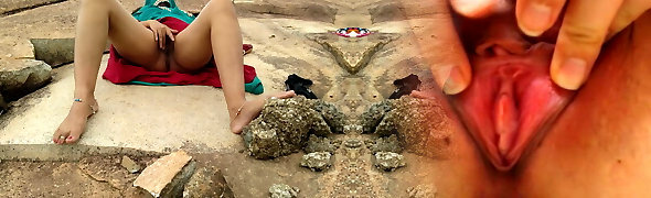 lesbian twins have fun with each other's pussies on the beach. Two cute nymphs with small hooters are best friends