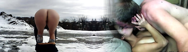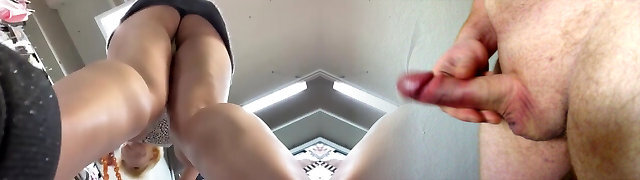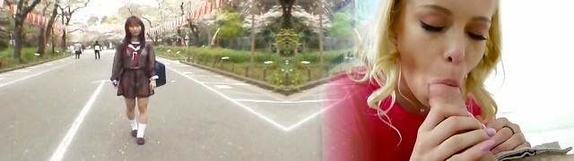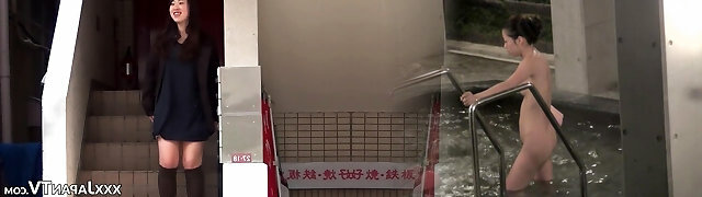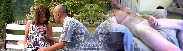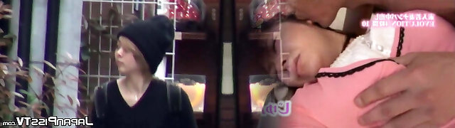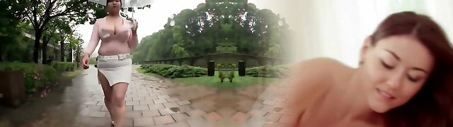 Asian big-boobed babe was walking around the mall and demonstrating her panties to find two men who would pummel her