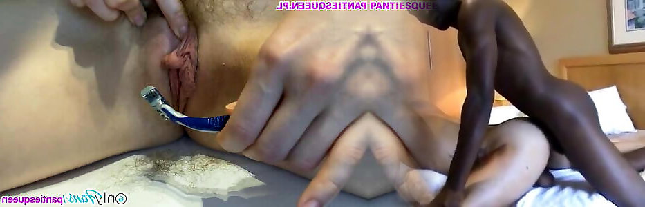 Shaving hairy vag. Showing clean-shaved puffy muff with huge lips