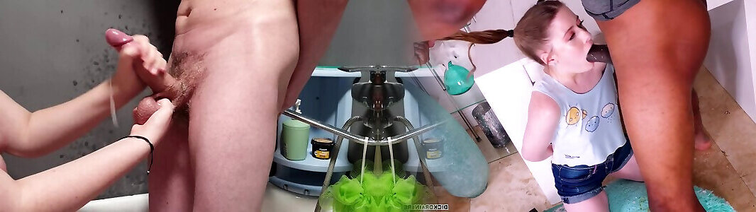 The girl skillfully washes and masturbates her boyfriends cock getting a hot ending.