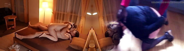 The slut housekeeper in bedroom service!lures the hotel waiter to have her pussy fucked and creampied without a condom!