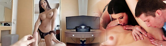 Super hot busty Asian shemale sucks his giant long dick