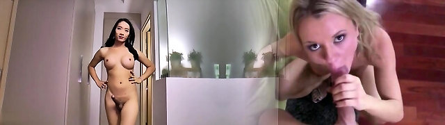 Big dick blonde t-girl enjoying asian TS beauty